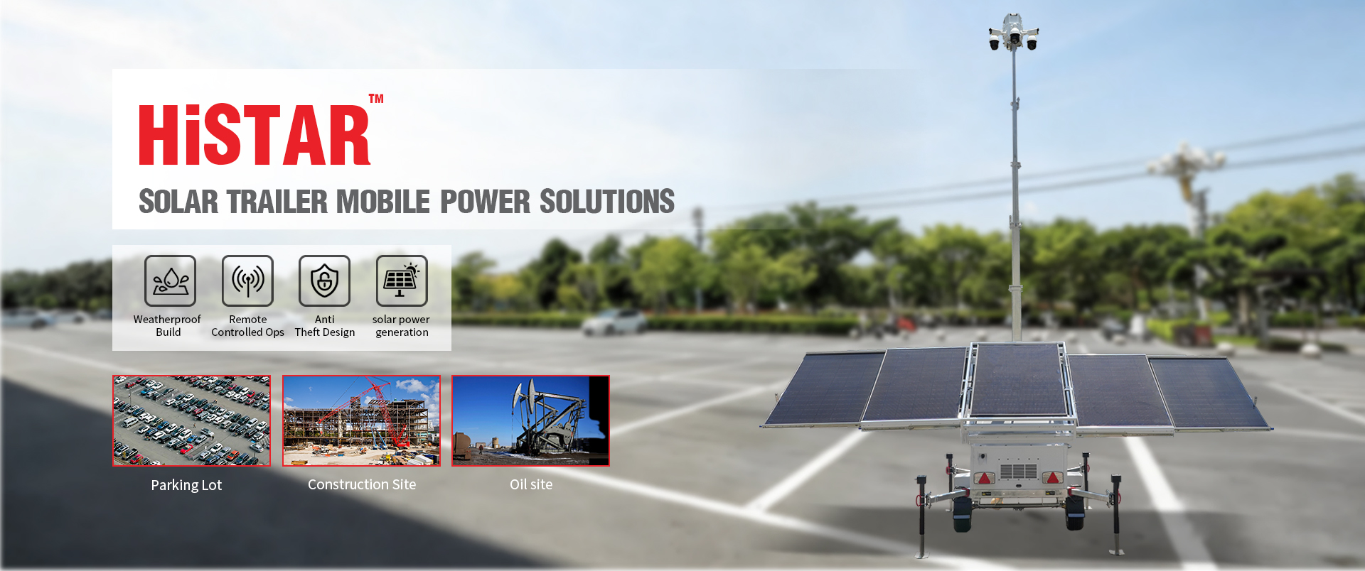גרור מגדל תאורה HiSOLO גרור מגדל התאורה HiSOLO הוא פתרון תאורה וניטור סולארי בעל ביצועים גבוהים, המיועד ליישומים מקצועיים חיצוניים. הוא מספק פעולה אמינה מחוץ לרשת החשמל, ניידות קלה ופריסה גמישה, מה שהופך אותו לאידיאלי לאתרי בנייה, אזורי כרייה, אירועים, אבטחת גבולות ותגובת חירום. ניידות ויכולת הסתגלות עוצב לפי תקני ארה"ב/האיחוד האירופי/אוסטרליה, ניתן לגרירה בכביש ומתאים למגוון שטחים. מבנה עמיד בפני מזג אוויר לשימוש חיצוני לטווח ארוך. אפס פליטות ותחזוקה נמוכה 100% מופעל סולארית עם גיבוי סוללה אופציונלי - שקט, נקי וחסכוני.